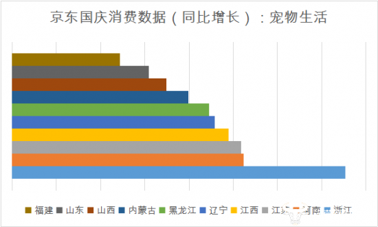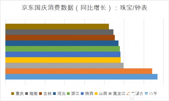 国庆期间结婚扎堆,带动了珠宝、手表等贵重物品消费。不过有意思的是,假期前半段消费主力集中在江浙沪等东南省份,但后半段起山东、内蒙古、黑龙江、山西和陕西呈现出压倒性增长,这是否可以说明南方人多选在1-3日办婚礼,而北方人则集中在4-6日扎堆结婚呢。