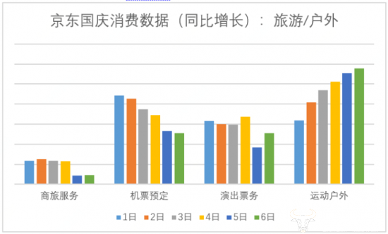 从数据上看,商旅服务、机票、演出票务增长平稳,受到预订因素的影响,涨幅在假期后半段逐步回落,不过演出门票在6日又出现回升;而运动户外的增幅则“日日攀升”,显示出人们外出旅行的热情持续高涨。