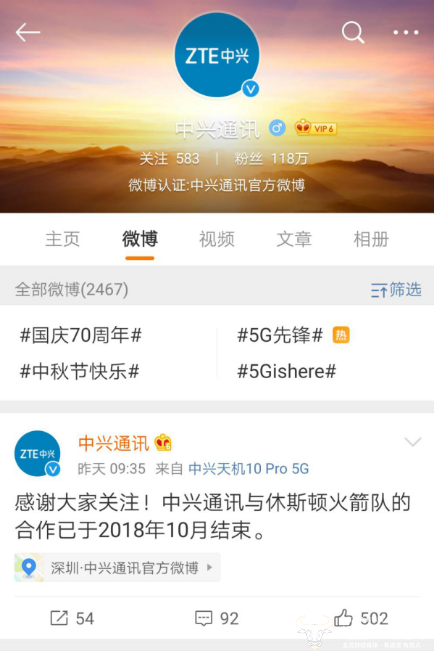 10月7日,中兴通讯官博一则不过十几字的声明引起关注,“中兴通讯与休斯顿火箭队合作已于2018年10月结束”,为何中兴要大张旗鼓的强调这个?运营商财经网了解到这与休斯顿火箭队总经理莫雷的不当涉港言论有关。