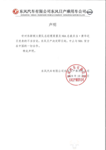 10月9日15时33分,东风日产在官博发表声明,“针对休斯顿火箭队总经理莫雷和NBA总裁肖华的不当言论,中止与NBA官方在中国的一切合作”。一则声明背后不仅是爱国精神的支撑,更是壮士断腕的决心,不过,受益于与NBA合作的东风日产会为这则声明付出多大的代价?