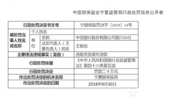 近日,中国银保监会宁夏监管局近日发布行政处罚决定书显示,中信银行股份有限公司银川分行因违规发放委托贷款,被罚20万元。