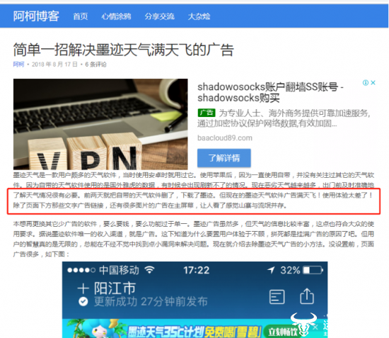 事实上,墨迹天气多次被曝光发布违规广告。据南方都市报报道,“墨迹天气曾在“推荐”的前50条资讯内容中,广告最多达8条,壮阳广告最多时占一半,这些广告用露骨语言宣传功效,通过微信售卖“中成药胶囊”和“调理方案”,宣称已帮助超过3万人‘壮阳成功’。”