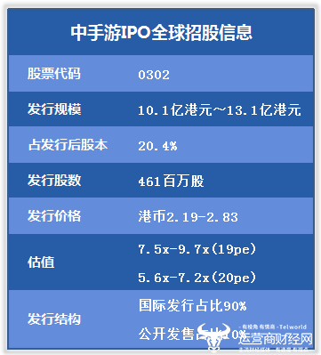根据披露的信息,中手游此次将于全球发售4.61亿股(视乎超额配售权行使与否而定),其中国际配售股份为4.149亿股(可予重新分配部分视乎超额配售权行使与否而定)。发售定价区间为每股2.19港元至每股2.83港元。以此价格区间折算,则中手游的募资规模区间为10.1亿港元至13.1亿港元。