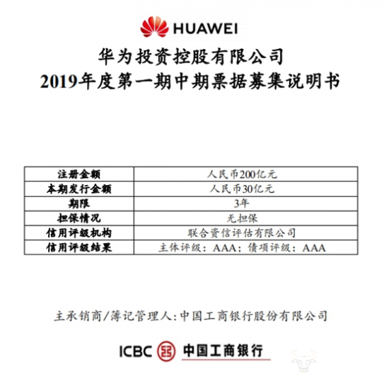 这家华为子公司的票据募集说明书显示,华为此次发行金额30亿元,期限3年,无担保,工商银行为此次中期票据发行的主承销商和簿记管理人,两期票据的评级机构均为联合资信评级,主体长期信用等级和债项评级均为AAA。