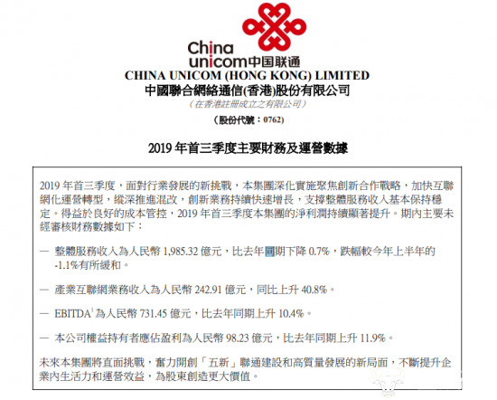 中国联通方面表示,2019 年首三季度,面对行业发展的新挑战,中国联通深化实施聚焦创新合作战略,加快互联网化运营转型,纵深推进混改,创新业务持续快速增长,支撑整体服务收入基本保持稳定。得益于良好的成本管控,2019 年首三季度本集团的净利润持续显著提升。