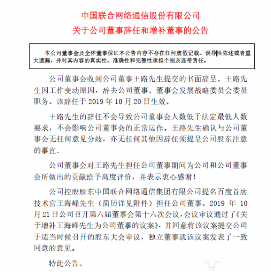 据运营商财经网了解到,王路因工作变动原因,辞去联通董事、董事会发展战略委员会委员职务,该辞任于2019年10月20日生效,因为百度是联通的股东,因此将直接由百度指派联通董事一职。