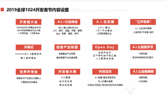 运营商财经网了解到,本次大会将由1024开幕式、1024计划发布、生态产品发布、2019iFLYTEK AI开发者大赛决赛、Al生态展、行业高峰论坛、1024颁奖盛典、AI健康跑、公益音乐节、市民Open Day等系列节日活动联合呈现。其中,AI主题元素贯穿其中。