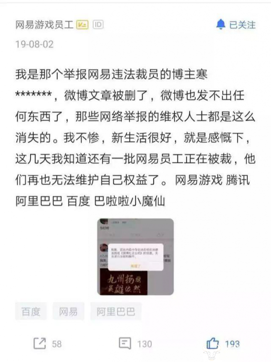 从今年网易被曝出裁员以来,有很多网易的同事在网上发帖曝光网易的行为,然而其中的很多帖子却被辟谣、删除,甚至账号被封禁。HR在跟我谈话的时候,说仲裁之后就算判了,公司也会上诉之类的,要两年时间,你耗不起。