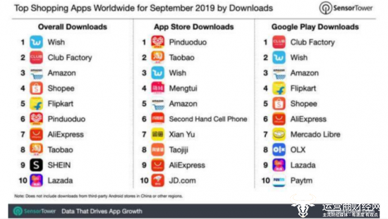 2019年9月,拼多多、手机淘宝、Wish位列全球APP Store购物类应用榜前三。在全球购物类应用总榜单(APP Store+Google Play)上,由于未统计包括腾讯应用宝、华为应用商城等在内的第三方平台数据,拼多多、手机淘宝的9月下载量分列全球第6和第8