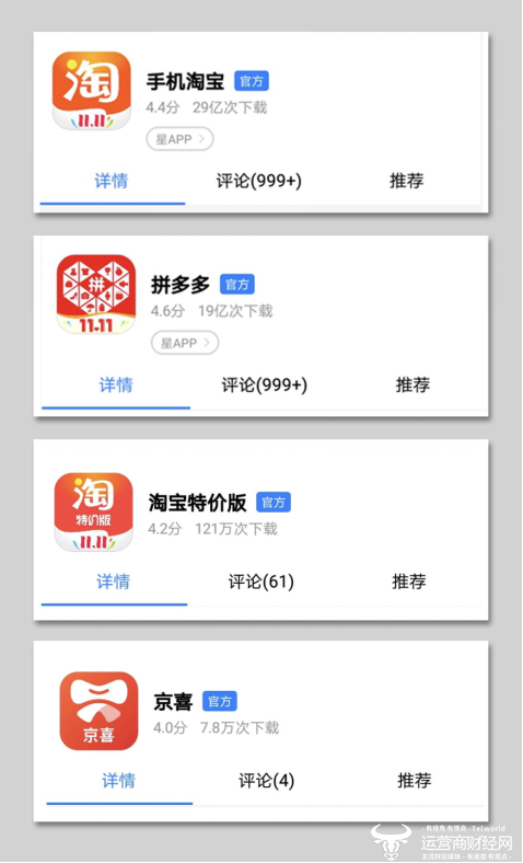 腾讯应用宝数据显示,截至目前,手机淘宝的总下载量已达29亿次,上线仅4年的拼多多,下载量急速攀升至19亿次