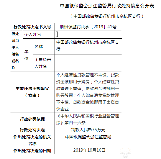据处罚文件显示,中国邮政储蓄银行杭州市余杭区支行,因个人经营性贷款管理不审慎、贷款资金被挪用于购房;个人经营性贷款管理不审慎、贷款资金被挪用于购买股票;个人综合消费贷款管理不审慎、贷款资金被挪用于出资合伙企业。被罚款人民币75万元。