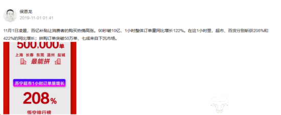 11月1日凌晨,苏宁易购总裁侯恩龙更新微头条,公布 “双十一全民嘉年华”1小时战报。数据显示:今年双十一消费者“买买买”的热情高涨,1分30秒时已破10亿,一小时整体订单量同比增长122%。
