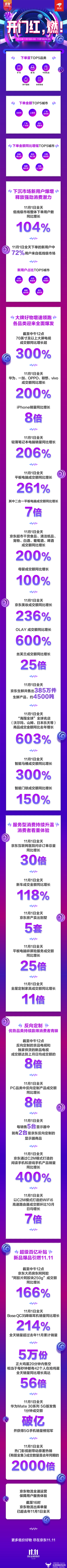 截至到11月1日24时的京东大数据显示,北京、上海、深圳、广州、成都成为首日下单金额最高的5座城市;而从增幅上来看,黄山、荆门、新余、南平、三门峡则排在前列。1日全天,低线级市场整体下单用户数同比增长104%,下单的新用户中72%用户来自低线级市场,焦作、保定、聊城、泉州、温州5座城市中的新用户占比最高。
