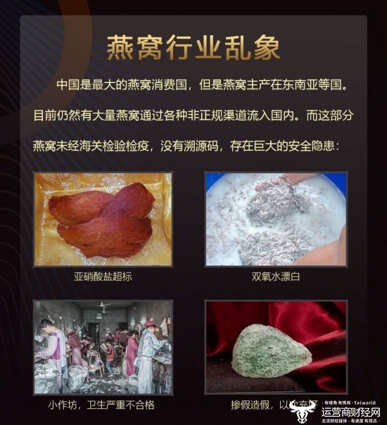 全国城市农贸中心联合会会长、世界批发市场联合会主席兼亚太工作组主席马增俊表示,“我国燕窝进口量和消费量呈现井喷式暴涨,很多以跨境电商为名的平台和个人卖家,将大量非正规渠道的燕窝带入国内市场,存在亚硝酸盐含量超标、双氧水漂白、发霉、细菌超标等众多安全隐患。这种形式和走私案件的性质一样,是非法的。”