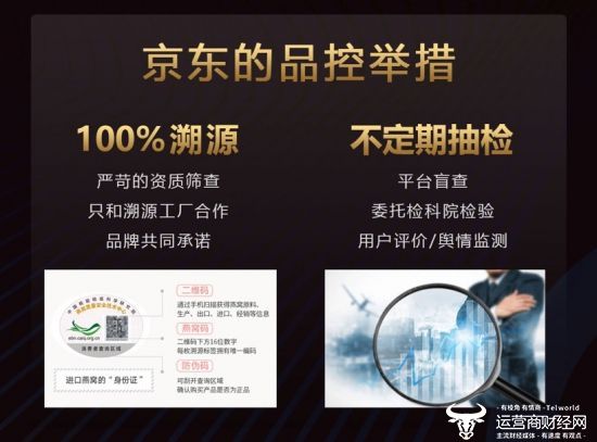 为了确保平台消费者的权益得到最充分的保障,在本次发布会上,京东进一步推出了假一赔十的平台监管政策,销售非正规进口、无溯源码以及亚硝酸盐超标的干燕窝商家和品牌一经核实,向消费者假一赔十。为了确保举措落地,京东特别聘请检科院为平台燕窝品类的监督、检测机构,全部开放、主动接受检科院的监督和检测。