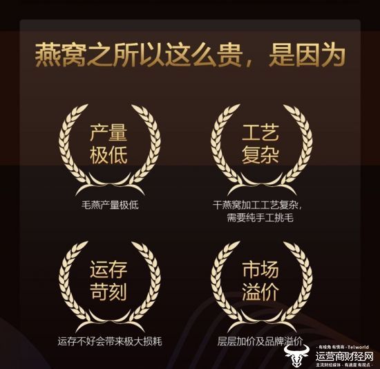 “燕窝之所以这么贵,是因为毛燕产量极低,而且干燕窝的加工工艺复杂,需要采用纯手工挑毛工艺;此外,运输和保存条件十分苛刻,暴力运输会带来极大损耗,再加上多个环节的层层加价,以及市场品牌溢价等因素,进一步拉高了燕窝售价,”京东健康滋补养生业务部总经理徐晶介绍道。