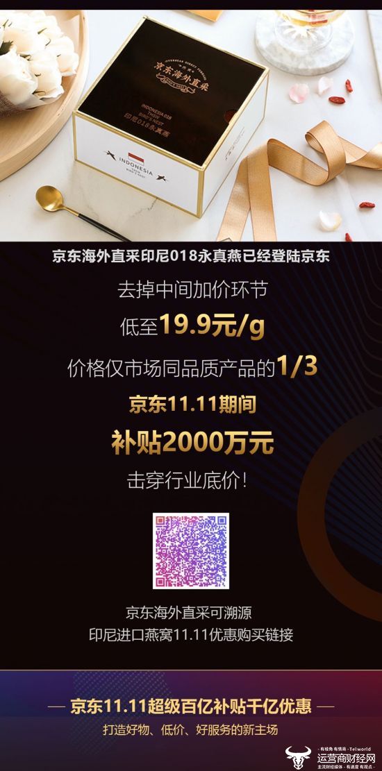 为此,京东在滋补品行业率先采用电商平台原产地直采模式,即去除众多中间商加价环节,京东到燕窝原产地直接采购、直接销售,为让燕窝走入千家万户、实现平价。为推广相应燕窝,京东11.11期间补贴2000万元,进一步击穿行业底价。