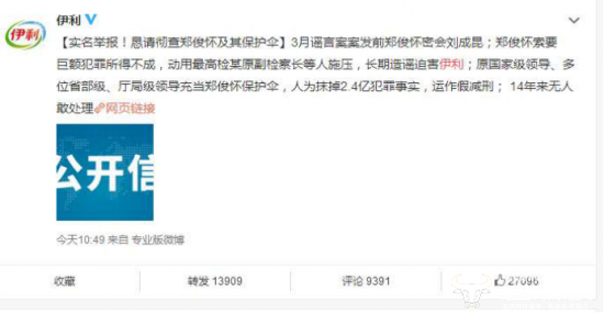 同日,伊利发微博,“实名举报!恳请彻查郑俊怀及其保护伞”。