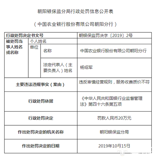 近日,中国农业银行股份有限公司朝阳分行因违反审慎经营规则,服务收费质价不符,被罚20万元,不知道行长杨绍军是怎么管理的?