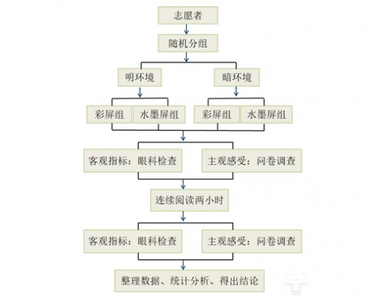 为了更深一步探究和比较不同手机屏幕对干眼症状体征的影响,晋秀明团队向社会招募120名符合标准的志愿受试者,并将招募的合格受试者随机地分在4组中:第一组受试者为明环境下使用OLED屏幕的智能手机(Light+OLED组);第二组受试者为暗环境下使用OLED屏幕的智能手机(Dark+OLED组);第三组受试者为明环境下使用电子水墨屏幕的智能手机(Light+eInk组);第四组受试者为暗环境下使用电子水墨屏幕的智能手机(Dark +eInk组)。受试者被要求在对应的环境下使用对应类型屏幕的手机进行连续2小时的阅读。