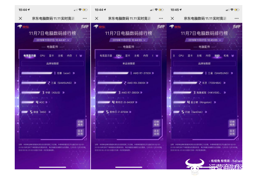 就电脑配件品类来看,排位之争也愈演愈烈。昨日电竞显示器销售额前三被宏碁、三星、华硕三巨头再次占领;而CPU品类今日不再是英特尔的主场,AMD三款单品力压英特尔霸占前列;在SSD品牌销售额榜上,三星后劲十足,直奔TOP1地位。
