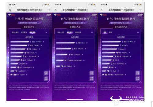 纵观影音娱乐榜单,佳能与索尼之争还在继续,佳能在本日表现仍然优秀,稳住了摄影摄像品牌销售额榜首地位,索尼、尼康位居其后;在摄影配件上,大疆仍然一家独大,雷打不动连续7日霸占榜首。而在耳机品类,索尼则力压beats、BOSE等品牌再度夺冠;漫步者则以重磅好物登顶音箱销售额榜首。在智能网络产品中,普联不再是唯一霸主,只占据网络设备一席榜首之地,华为则是凭借5G路由器的强大冲劲闯入高速路由器第一位。