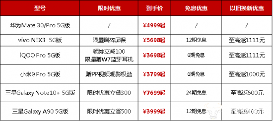 其中包括vivo NEX3 5G版、iQOO Pro 5G版、小米9Pro 5G版、三星Note 10+ 5G版等各大品牌最新5G产品,苏宁易购双十一拿出6至24期免息分期、最高1111元的以旧换新补贴,同时还有限时立省300-500元的立减优惠。