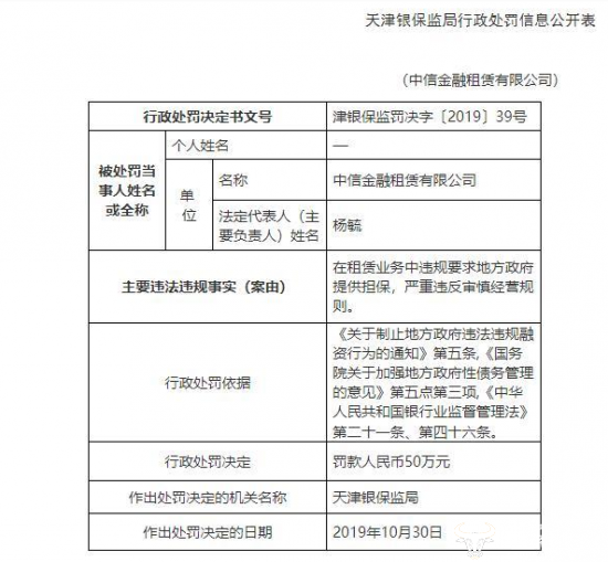 近日,天津银保监局近日公布关于中信金融租赁有限公司的行政处罚信息。因违规要求地方政府提供担保,严重违反审慎经营规则,罚款50万元,其中总经理俞子彦以及副总经理徐海秀予以警告,不知作为法定代表人的杨毓是否知晓其中的猫腻?
