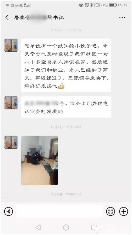11月2日中午11点半,姜晶学接到客服派发的故障单后及时联系报修用户,用户称自己为户主妹妹,远在南京,反映家中电话一直无人接听,家中有两位八十多岁的生病老人。放下电话后,他骑上车直奔用户家,到达后发现用户家中屋门反锁,敲门一直无人应答。姜师傅没有放弃,一直敲了20多分钟,把周围邻居都敲了出来。经与户主妹妹联系,邻居们证实,家中有两位老人,一位老人平时瘫痪在床,另一位老人小脑萎缩,两位老人很少出门。户主妹妹表示如果长时间没有人开门就算了,让姜师傅回去。本着对用户负责的态度,他没有走,而是转到户外(用户家住1楼),从外面打开窗户,向屋内喊话。屋内微弱的回应声让他更加确定了老人在家,姜师傅再次联系户主妹妹,同时报警,并找来居委会、物业、小区保安和开锁公司,并自行垫付200元开锁费,在警察、居委会、物业人员在场的情况下将用户家门打开。姜师傅第一个冲进房间,映入眼帘的是一位老人躺在厨房的地上,面朝上,已经没有知觉,拐弯进入客厅后,另一位老人趴在客厅,脸部大面积挫伤,姜师傅又及时拨打了120将老人送往医院抢救。经医院诊断,两位老人一个为脑梗,另一个趴在客厅的老人身体大面积创伤,如果再晚一点发现就会有生命危险。