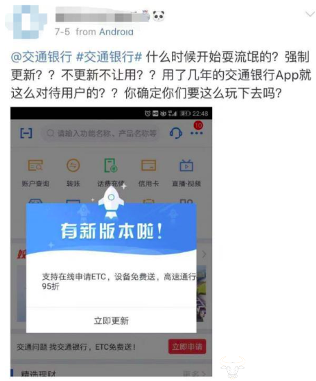此外,交行会不断更新APP版本为用户推出新体验,但是强制安装更新让很多用户很不满。