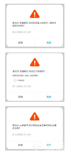 首次使用交通银行APP需要进行访问权限设置。用户需要对是否允许交通银行访问设备上的照片、媒体内容和文件;是否允许交通银行获取手机号码、IMEI\MISI;是否允许交通银行通过网络或者卫星对设备定位权限进行授权。