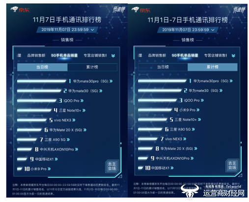5G手机单品销量方面,1分钟销售额破亿的华为5G版华为Mate 30系列依旧位列第一、第二,5G大明星vivo iQOO Pro位列第三、vivo另外一款5G手机NEX3位列第五,位列第四的为三星Note 10+。11月9日即将迎来vivo京东超品日活动,vivo是否会凭借着两款5G手机反超,大家拭目以待
