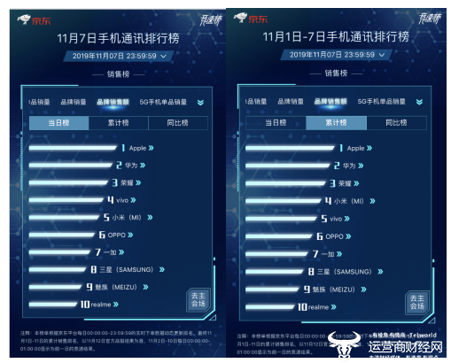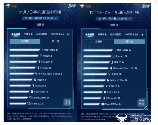 此外在单品销量方面,荣耀10青春版、荣耀20凭借品牌日活动夺得单品销售冠军和亚军,iPhone 11位列第三;值得一提的是,在累计榜方面,荣耀10青春版连续7天蝉联冠军,成为京东手机11.11期间的“真香机”。