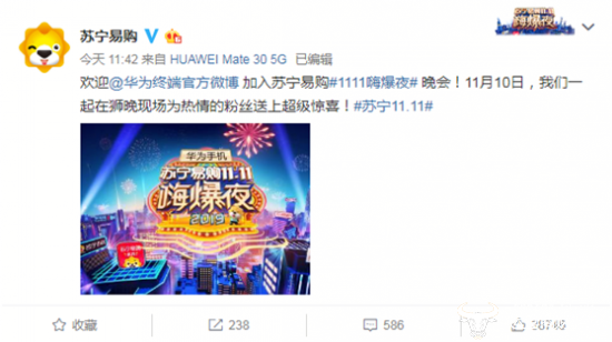 11月8日,苏宁易购和华为联合官宣,华为手机成为湖南卫视苏宁易购11.11嗨爆夜总冠名,将一起在狮晚现场,为热情的粉丝送上超级惊喜,双十一开展深度合作,共同引爆嗨爆夜狂欢。