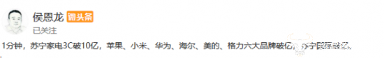 11日零点刚过,侯恩龙就通过微头条表示,“1分钟,苏宁家电3C破10亿,苹果、小米、华为、海尔、美的、格力六大品牌破亿,苏宁国际破亿。”