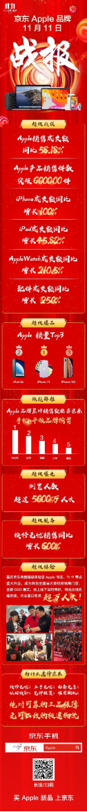 2019年京东11.11全球好物节迎来了最激动人心的一天,在过去的24小时,京东11.11持续保持加速增长,再一次交出了一份令人满意的答卷,其中最受人瞩目的当属Apple品牌。京东11.11期间,Apple销售成交额同比58.18%,Apple产品销售件数突破600000件,其中iPhone成交额同比增长100%、iPad成交额同比增长45.82%、Apple Watch成交额同比增长210.5%以及配件成交额同比增长250%。单品表现方面,京东11.11期间iPhone XS 系列销售同比增长150%,11月11日当天仅5分钟,年度爆款iPhone 11 Pro系列销量便突破万台。