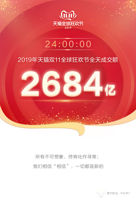2019天猫双11全天成交总额最终定格在2684亿元。这一新的商业纪录宣告新消费时代全面到来。