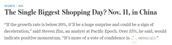 在近日刊登的题为《世界上最大的购物节是什么?中国的双11》一文中,《华尔街日报》刊文分析,通过双11,可以观察和预测出中国经济的发展趋势。