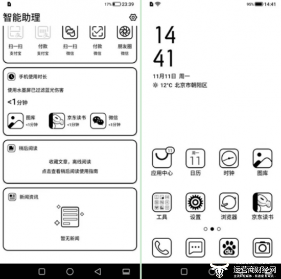 界面布局上更是延续了极简式设计,去掉一切冗余信息突出阅读属性。主界面除了日常的微信社交,就是京东读书、掌阅、阅读、咪咕阅读、人民阅读等APP,像一般智能机会预装的购物类、视频类APP,海信阅读手机A5统统没有。甚至是系统自带的桌面壁纸选择上,也大多为符合极简设计的静雪、灯塔、安静时光等图案。