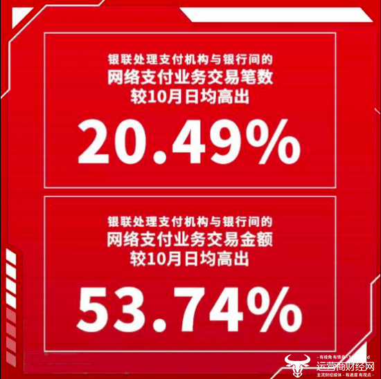 银联公布的数据显示,11月11日,银联处理支付机构与银行间的网络支付业务交易笔数较10月日均高出20.49%,网络支付业务交易金额较10月日均高出53.74%。为“双十一”提供平稳保障的同时,给消费者打造了流畅便捷的支付体验。