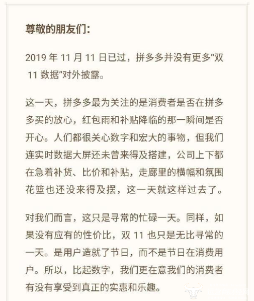 至于最近市值基本与京东持平的拼多多,则发布公开信称,自己不谈双 11 数据。