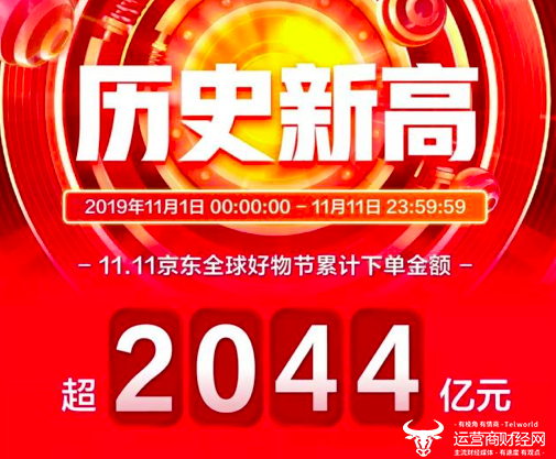 另外一个2000亿诞生在老对手京东,京东则宣布“11.11 京东全球好物节”累计下单金额超 2044 亿元。