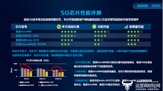 中国移动同期发布的《中国移动2019年智能硬件质量报告(第二期)》中包含4款5G芯片和7款5G终端的全面评测,在对芯片和终端多天线吞吐量的性能评测中,“玉衡系统”还原了用户使用场景中的低、中、高速三种典型场景下各芯片和终端的表现差异,为后续终端和芯片的多天线优化方向提供参考。