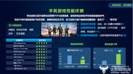 当下,移动游戏已跃升至移动互联网TOP2应用场景,游戏体验是检验手机性能的最佳参考,也是5G时代重要的用户娱乐场景,该报告从流畅性、发热、多媒体效果、反应速度、以及续航5大维度对10款手机进行了排名,其中华为Mate30Pro5G、努比亚红魔3S 、iPhone 11 Pro Max位列前三。