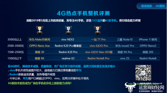 4G手机综合能力评测中,中国移动终端实验室根据手机的不同价位,对13个品牌的41款手机进行了专业测评。