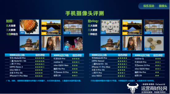 在娱乐互动领域中,该报告从手机游戏性能、摄像头(拍照+视频)、高清直播三大方面展开评测。