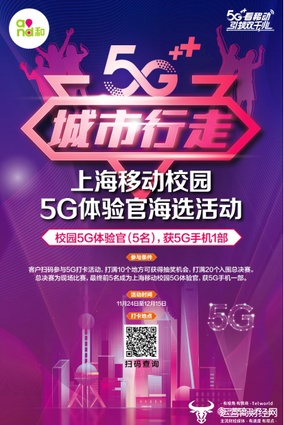 据悉,参与活动的同学需前往5G已覆盖地区进行拍照打卡,并将照片上传至活动H5页面,打卡10个即可以抽奖,奖品为各种丰富的权益礼包;打卡20个及以上的用户,则直接进入总决赛,入围现场PK,总决赛累计积分前5名的用户可以成为上海移动5G体验官,分别获得5G手机一部。