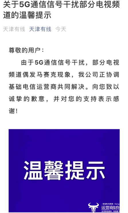近日,天津有线的公众号发布了一篇名为《关于5G通信信号干扰部分电视频道的温馨提示》的文章。天津有线在这篇文章里声称由于5G通信信号干扰,部分电视频道偶发马赛克现象,因此向用户表示诚挚歉意。