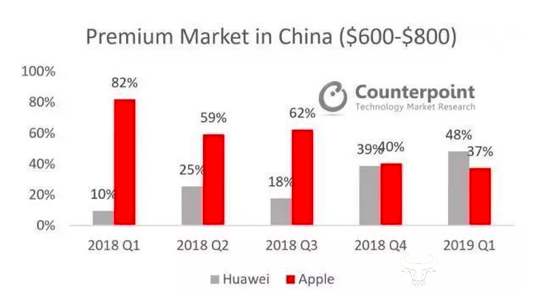9月份的数据显示,在3500+价格段上,华为与苹果一共包揽了84%的市场。而在600-800美元价格区间内(约合人民币4100元-5500元),华为与苹果分别占据48%和37%的市场份额,华为高出苹果11个点。