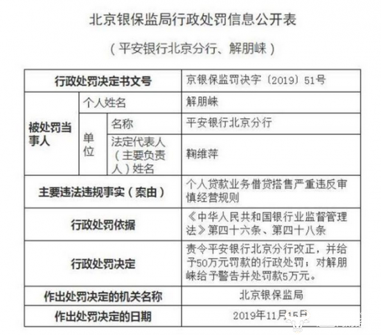 近日,平安银行北京分行因个人贷款业务借贷搭售严重违反审慎经营规则,北京银保监局依据《中华人民共和国银行业监督管理法》第四十六条、第四十八条规定,责令平安银行北京分行改正,并给予50万元罚款的行政处罚;对责任人解朋崃给予警告并处罚款5万元。